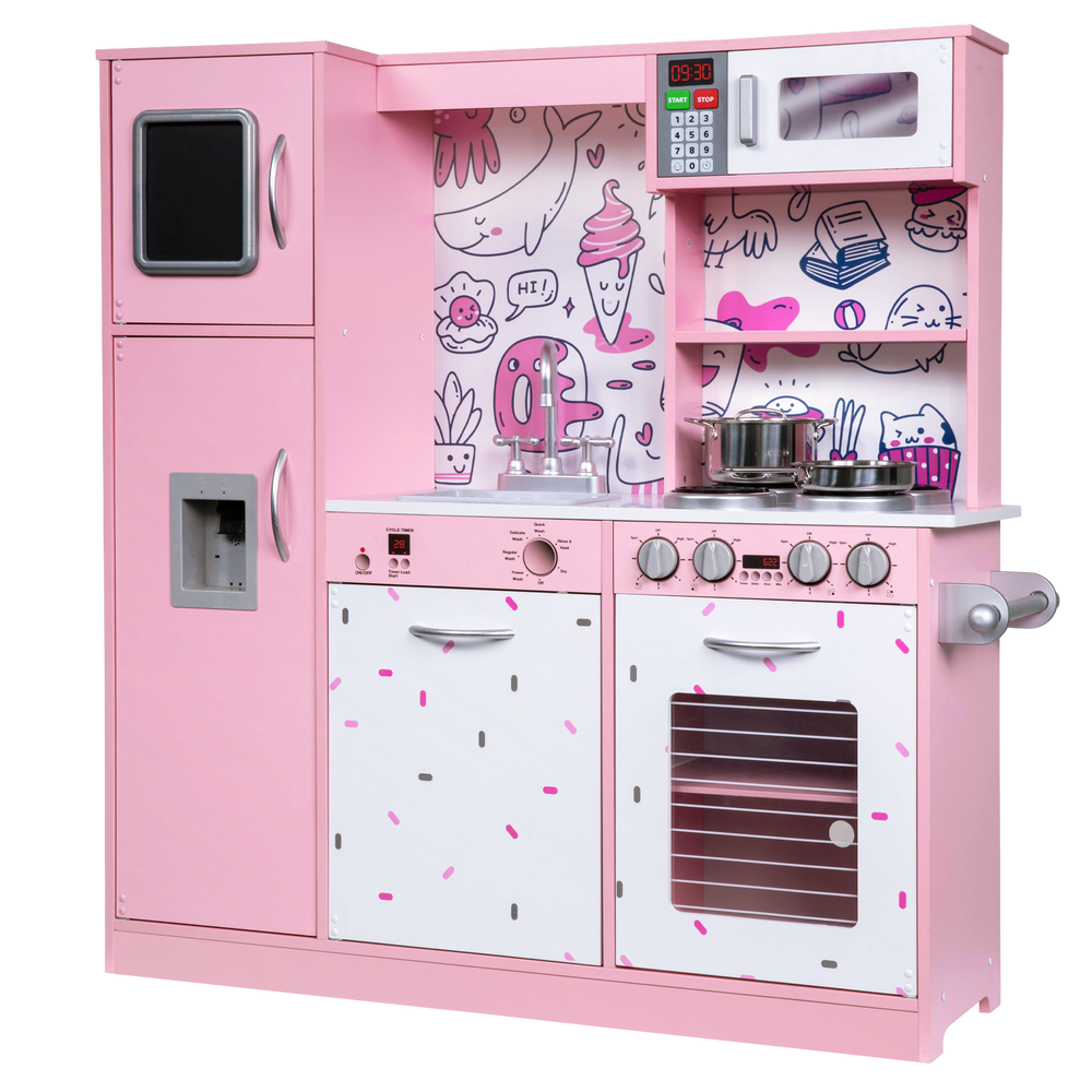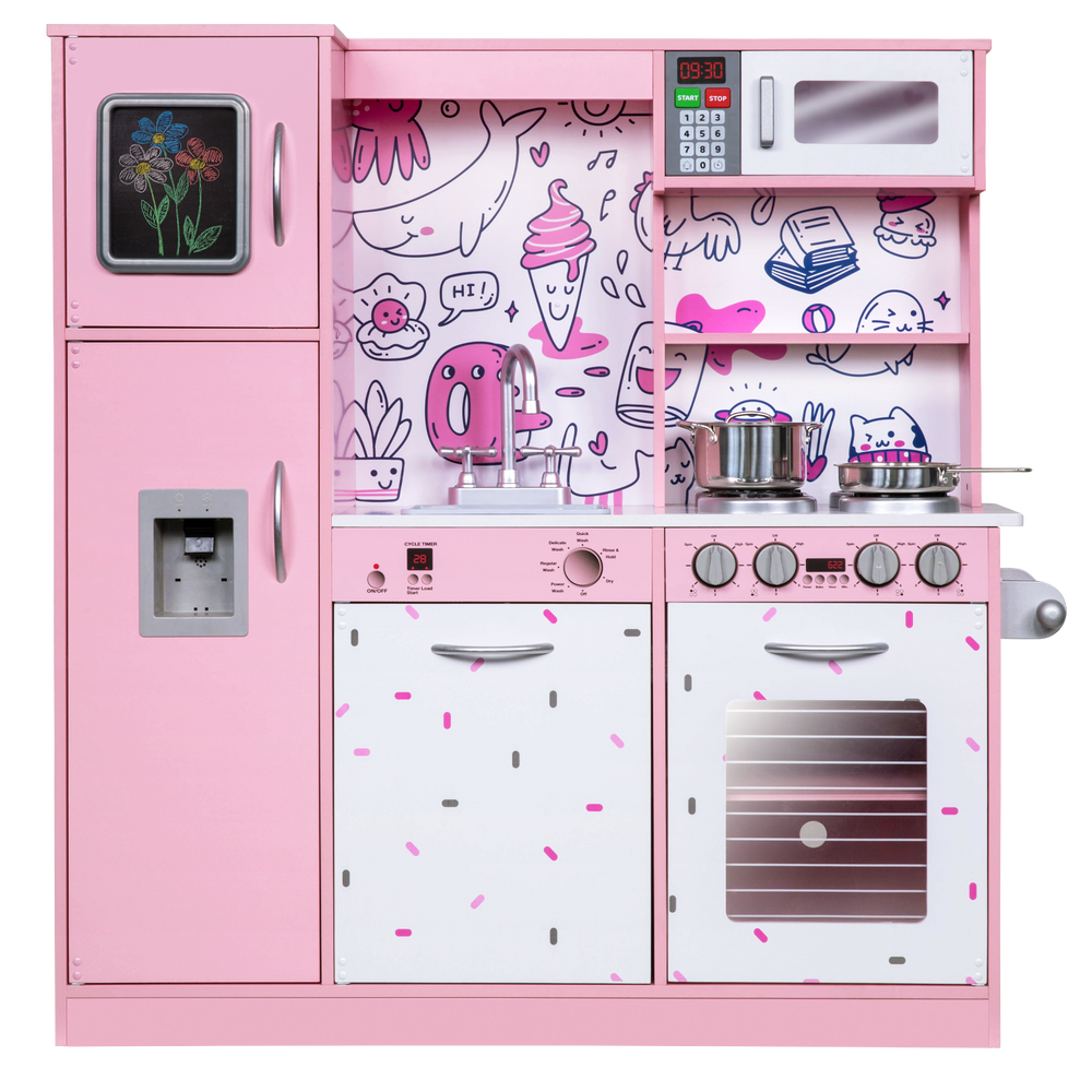 Your young chef will have everything they need to express their creativity and develop their imagination. This wooden kitchen is sure to keep your child engaged with the interactive faucet, ice dispenser, and stovetop accessories.