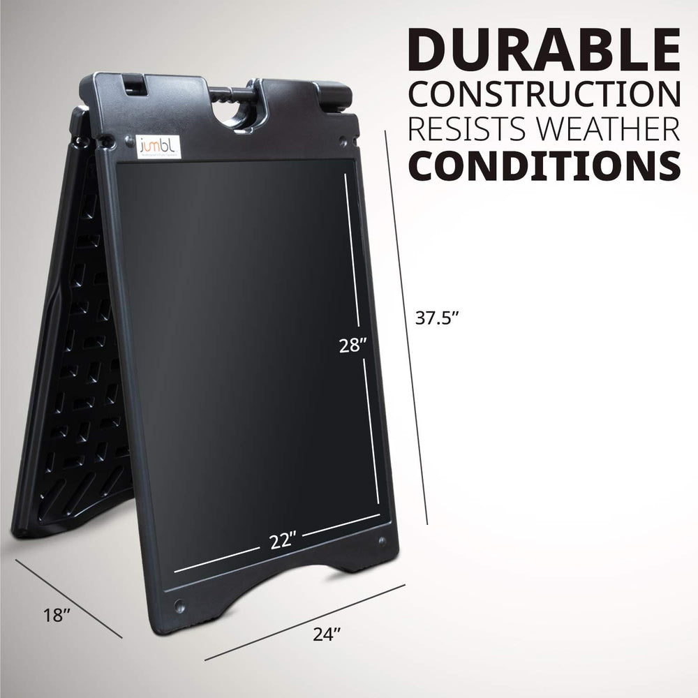 The signboard comes with an included waterproof PVC cover that will keep your poster dry for all to see. You can make a creative, beautiful poster that you can leave out without worrying about the rain. The sturdy signboard will stand tall all day long. With a built-in compartment to fill up with water, the Jumbl Black Waterproof A-Frame Signboard will not go down easily.