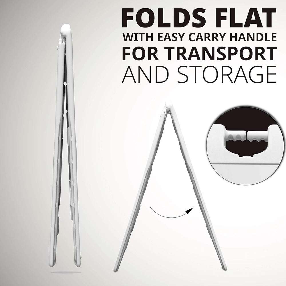 Present your message to the world with the Jumbl White Waterproof A-Frame Signboard. Whether it is an advertisement, warning, or just a simple greeting, this signboard is great to get your message across, rain or shine. Simply set up the sign and place your poster on the board. With the product’s double-sided design, you can have the same or two different posters on each side.