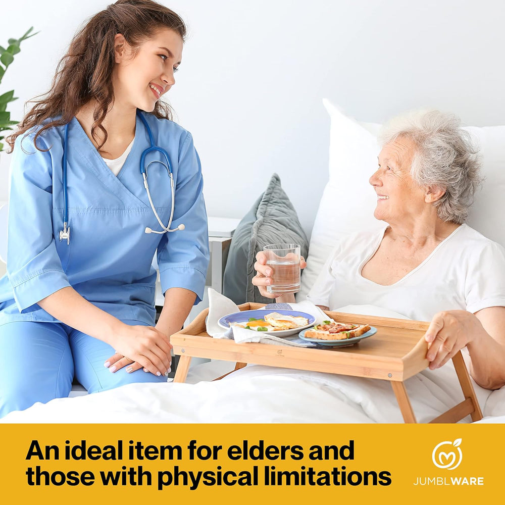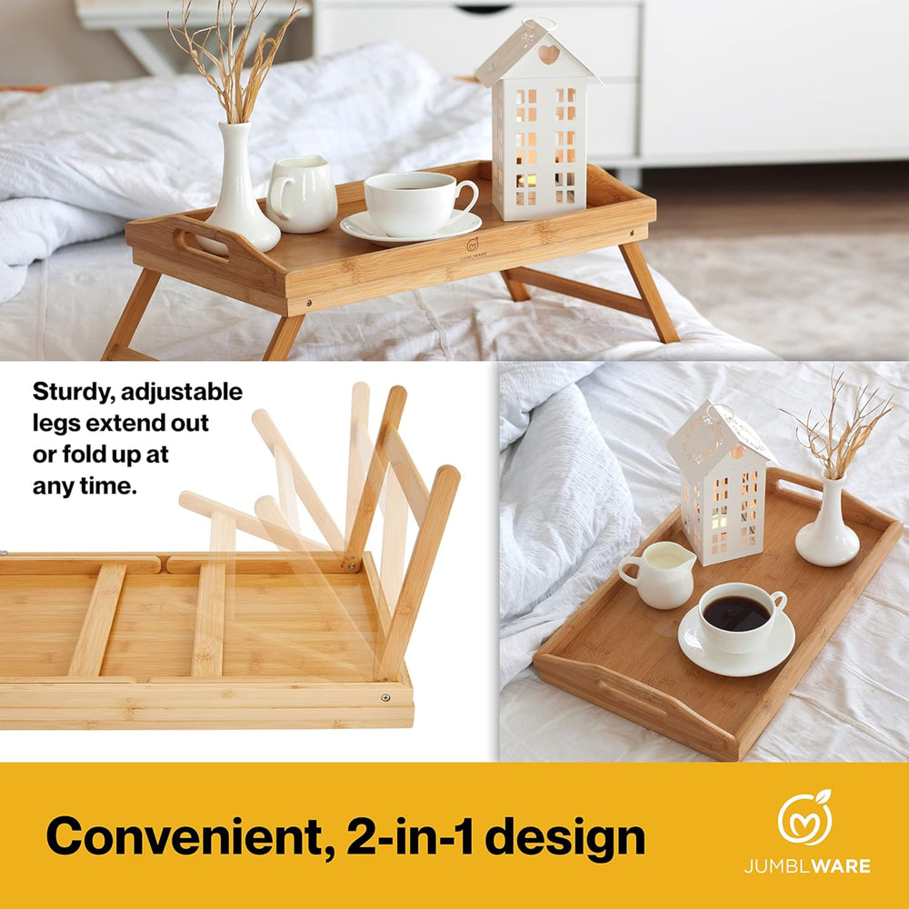 Enjoy your favorite meals while sitting on the sofa or in bed with the JumblWare Premium Bamboo Bed Table Tray. This versatile 18.5” x 10.75” breakfast tray is the perfect way to start off your day. Enjoy a beautiful breakfast in the comfort of your bed with a sturdy, convenient bed tray table. This 2-in-1 device works great as a tray and as a bed tray table with folding legs. This well-carved over the bed table is made from 100% natural, premium bamboo. This beautifully designed bed food tray made from sustainable bamboo will last you for years to come. Use this lightweight lap table for bed tray in the bedroom, living room, or den with the integrated carrying handles. Take a bit out of all your favorite foods filling up this large tray without worrying about spills thanks to the raised edges. Once you are done, simply wipe down this easy-to-clean tray for you to use all over again later. Enjoy meals the right way with the JumblWare Premium Bamboo Breakfast Tray.