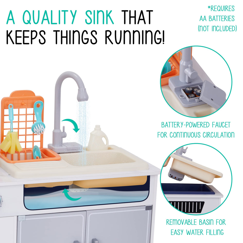 This toddler kitchen playset is not just gorgeous to look at, but super interactive and fun. The play kitchen for toddlers 1-3 comes with several kitchen-like functions to explore. Kids will be wowed by the realistic sink with running water that comes with this exceptional kids wooden kitchen. With a quality pump built into the faucet, your child will be in awe splashing around the water circulating through the sink. With realistic sounds and lights all over this workstation, your child will have fun with this wooden kitchen play set for hours to come. Unleash the little chef you love by giving him or her an awesome, interactive wood kitchen for kids they will enjoy.