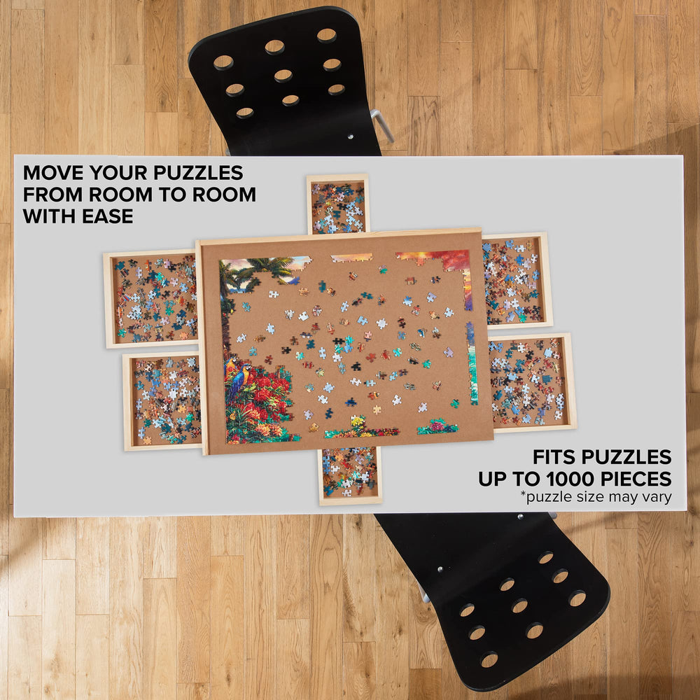 Love working on big puzzles but don't have a jigsaw puzzle board or puzzle sorter that saves the messy look of pieces piled across the table? With this Puzzle table with drawers, you get a dedicated puzzle organizer for future play. A blend of hardwood and fiberwood, the puzzle board with drawers is firm and sturdy while still being lightweight and easy to carry. Plateau-style surface on the puzzle board table provides a dedicated space to pursue your hobby or keep kids’ puzzles and other board games neatly contained. The included puzzle sorting trays are ready to protect your game from any mess. The jigsaw puzzle table trays allows you to organize your pieces & discreetly store them in the future. The SkyMall portable puzzle table is perfect for any occasion. Get a 1000 piece puzzle board from SkyMall on your cart today.