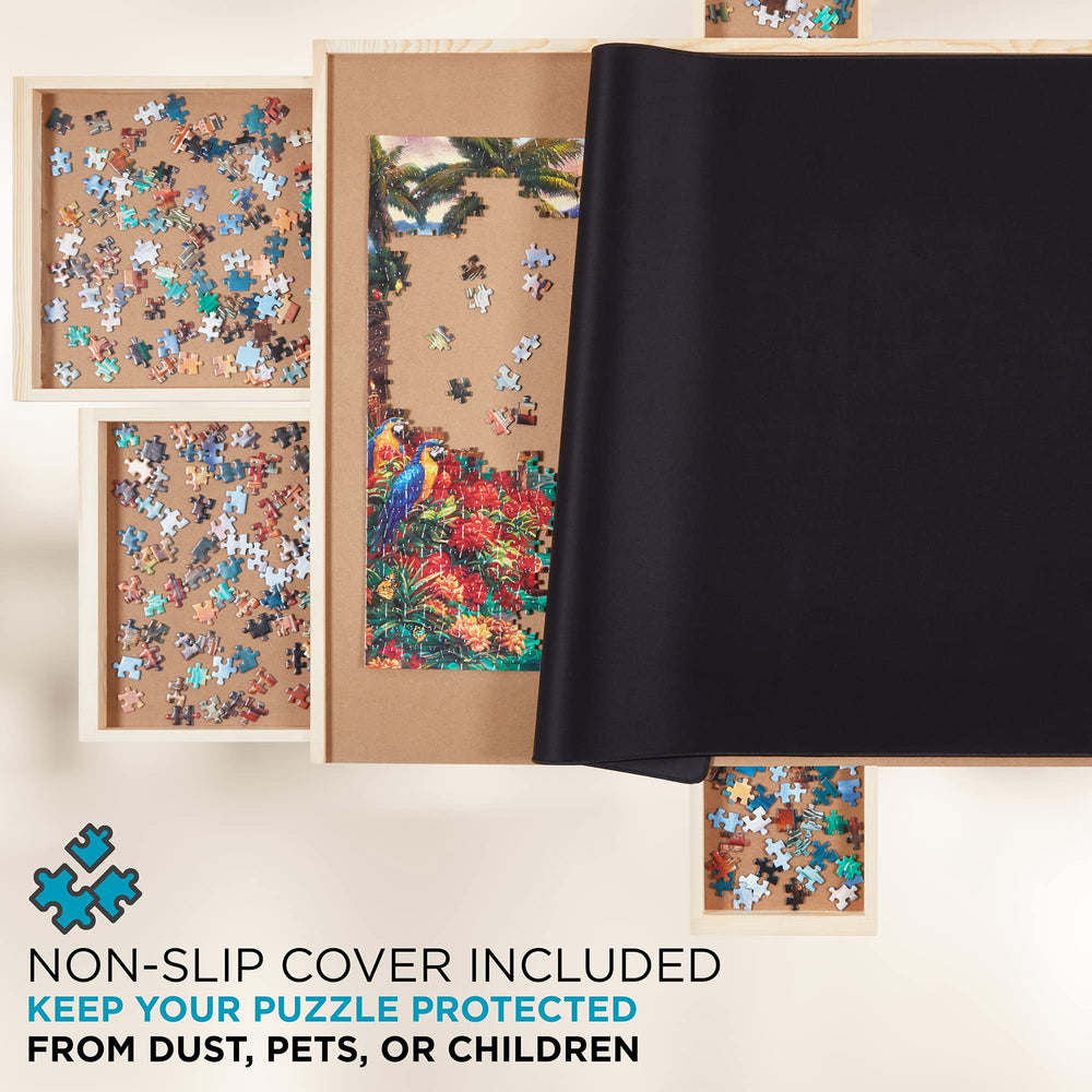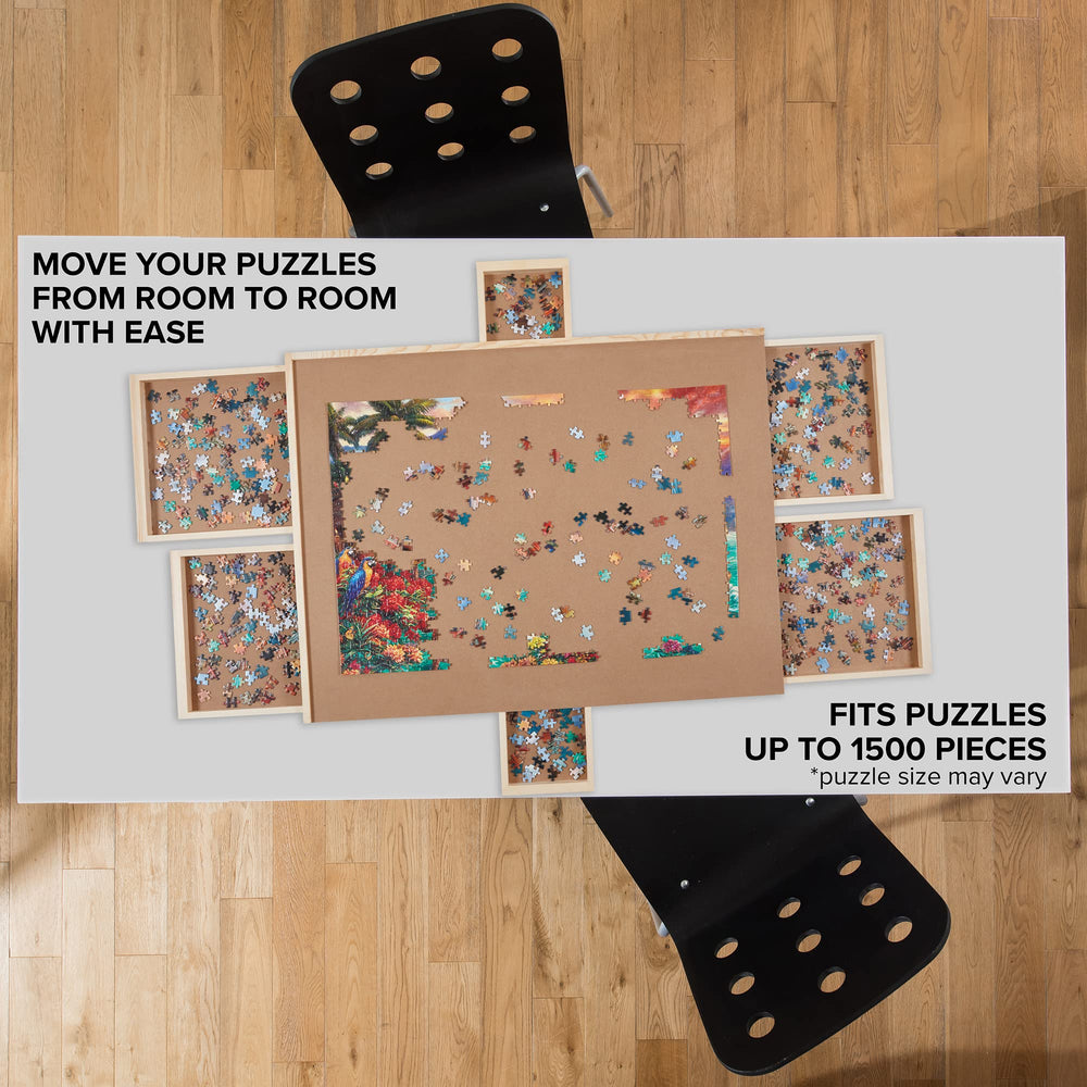 Love working on big puzzles but don't have a jigsaw puzzle board or puzzle sorter that saves the messy look of pieces piled across the table? With this Puzzle table with drawers, you get a dedicated puzzle organizer for future play. A blend of hardwood and fiberwood, the puzzle board with drawers is firm and sturdy while still being lightweight and easy to carry. Plateau-style surface on the puzzle board table provides a dedicated space to pursue your hobby or keep kids’ puzzles and other board games neatly contained. The included puzzle sorting trays are ready to protect your game from any mess. The jigsaw puzzle table trays allows you to organize your pieces & discreetly store them in the future. The SkyMall portable puzzle table is perfect for any occasion. Get a 1500 piece puzzle board from SkyMall on your cart today.