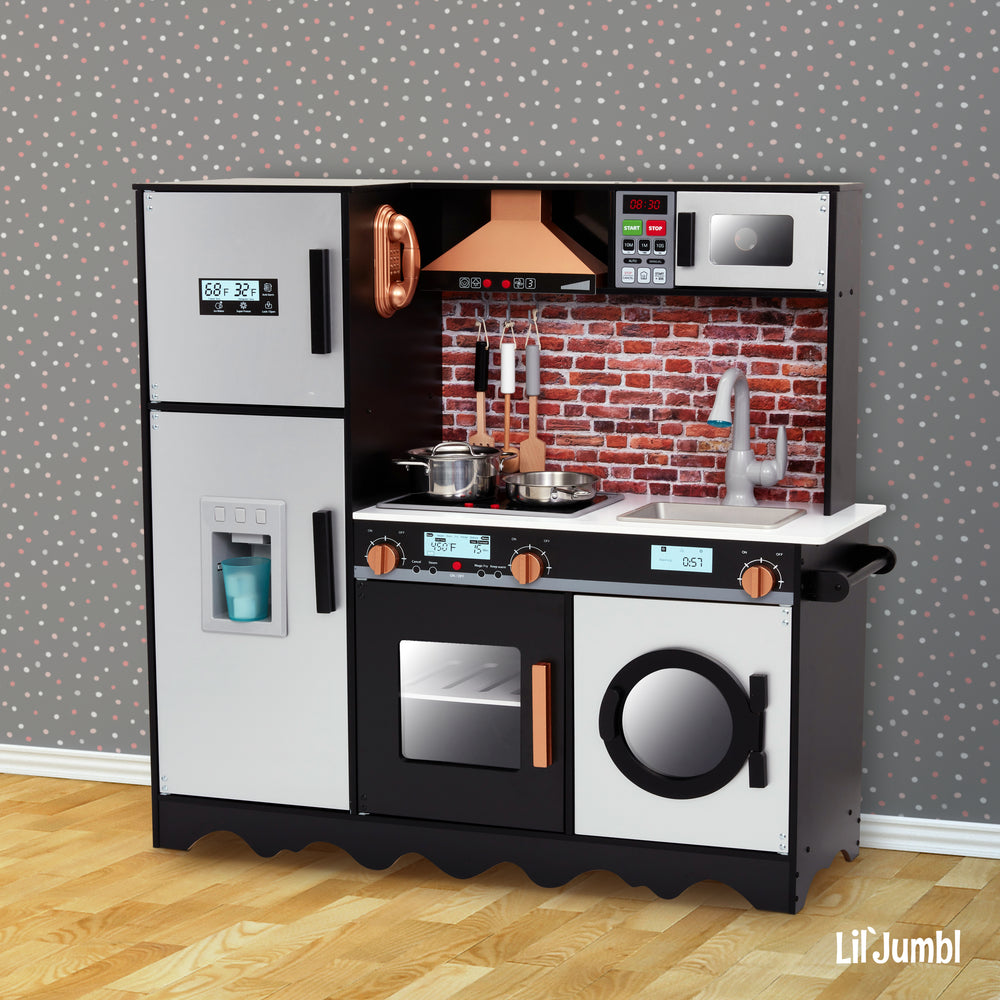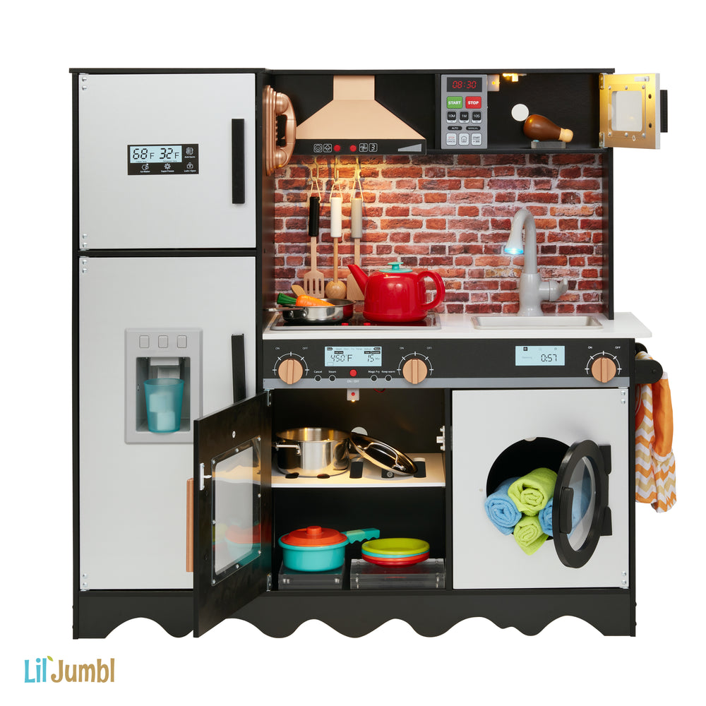 Cook up some memories! A classic kids playset gets a super realistic upgrade in the Wooden Play Kitchen from Lil Jumbl. Designed for children ages 3 and up, this educational setup features every essential appliance found in a real modern kitchen, so kids can pretend to cook, clean, and maintain a household—just like mom and dad. Watch in wonder as they store groceries in the fridge and freezer; flip pancakes on the stovetop; bake cookies in the oven; pop a snack in the microwave; flip on the faucet; load the dishwasher; organize plates and utensils; and so much more. Little ones learn as they play with plenty of interactive elements, exciting sights and sounds. And with step-by-step instructions and high-quality hardware included, assembly is refreshingly easy. Give your chef in training an unforgettable toy that’ll keep them occupied for hours—if not years! Add a Lil Jumbl Wooden Play Kitchen to your cart today. The heart of the home, come to life Play time has never felt so real with the Lil Jumbl Wooden Play Kitchen. Budding chefs and pint-sized homemakers discover the excitement and intrigue of a real working galley as they pretend to prepare food, serve guests, clean house, and organize their supplies just like a grown-up. Our cozy little cook space features all the essential parts of a contemporary kitchen in convenient compact design. Kids can interact with a real moving faucet, clicking knobs, turning dials, a light-up microwave keypad—even a pretended ice dispenser, stove top that makes realistic sound and light, range hood with built in sound & light, and a lighting oven! In the Lil Jumbl Play Kitchen, fun, learning, collaboration, creativity, and culinary excellence all collide.