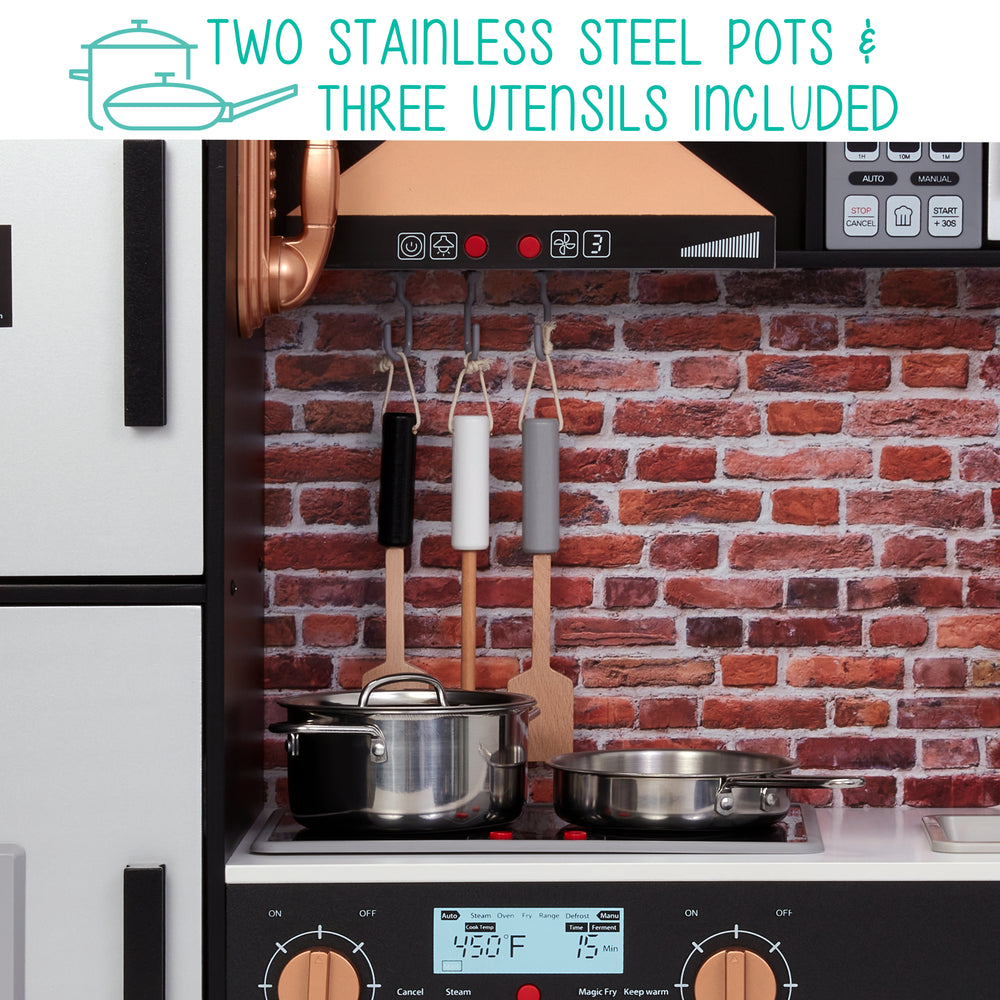 BONUS TOOLS & ACCESSORIES | Tots Can Start Playing Straight Out the Box with [2] Free Stovetop Toys [Pot & Frying Pan] & Integrated Chalkboard for Jotting Down Ingredients & Other Creative Play | Kitchen Also Features a Real Towel Rack & Other Authentic Details Like Faucet, Sink Knobs, Door Handles & Cabinet Windows.